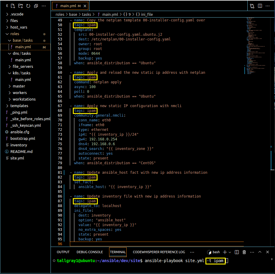 Additionally, we’ve integrated host network configuration into the “base” role by adding tasks to apply static network settings according to the values defined in the “inventory” file. Also, the tag definitions make it easy to run the playbook and effect only those select task modules, in case one-off scenarios arise when we only want to run those tasks and not the entire project. If we combine that with the –limit option at run time, we can really get granular with our deployments!