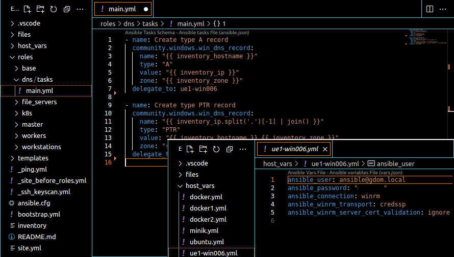To streamline the management of host network services, we’ll employ Ansible’s powerful modules. Picking up from where we left off in the previous article, we’ve added the “dns” role with tasks “Create type A record” and “Create type PTR record,” which leverage the “win_dns_record” module and authentication to Windows using “winrm” and “credssp” transport options. For more information regarding Windows authentication winrm, refer to Ansible docs.